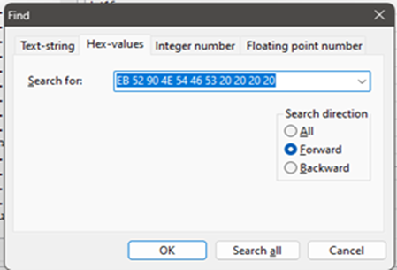 次に、NTFS パーティションの候補を探します。左上のバイトをハイライトし、検索機能を使って次の 16 進数文字列を検索します。10 進数やテキスト文字列 (検索オプションがある場合に限ります) ではなく、16 進数です。