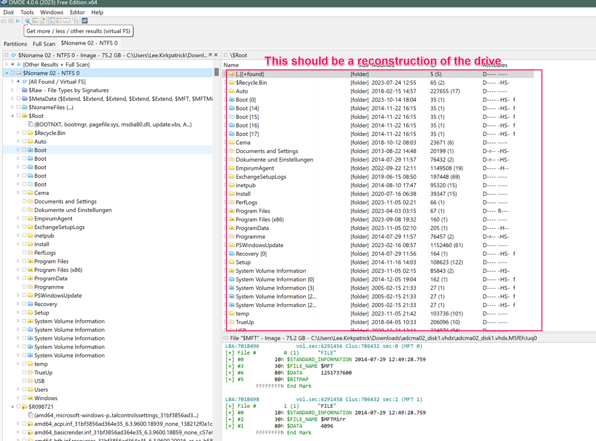 (部分的であっても) 復元に成功した場合、DMDE は EVTX ログ、amcache、レジストリハイブ、NTUSER.dat ファイルを含む多くの重要なシステムファイルを抽出できます。失われたパーティションを再構築し、ファイルシステムのメタデータを復元するソフトウェアの機能を活用することで、ユーザーは断片化または破損したデータセクターをまとめられます。そのため、ディスクの一部が暗号化によりアクセスできない場合でも、ファイルの抽出と復元が容易になります。DMDE を使用すると、標準的なフォレンジックアーティファクト収集ツールが通常収集するものを基にデータを復元できるため、データ復元の専門家にとって貴重な資産となります。