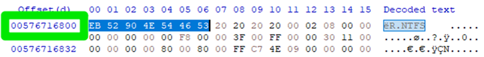 たとえば、図 16 でハイライトされている NTFS パーティションのヘッダーオフセットの 10 進数での値は 00576716800 です。(ご覧の通り、以下のスクリーンショットは、上に示したスクリーンショットのパーティションと同じパーティションのものではありません。しかし、上述の通り、この NTFS パーティションの bs 値 (オフセット 11 と 12 の値) も同じく 512 であることがわかります。)