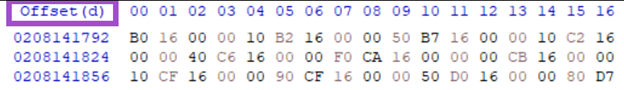 HxD を起動し、暗号化された VM ファイルをロードします。左端にある [Offset] の列をクリックし、10 進数 (base10) で表示されるように変更します。図 10 に示すように、HxD ではこの設定変更は (d) で表されます。