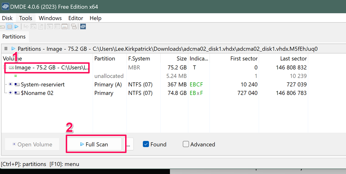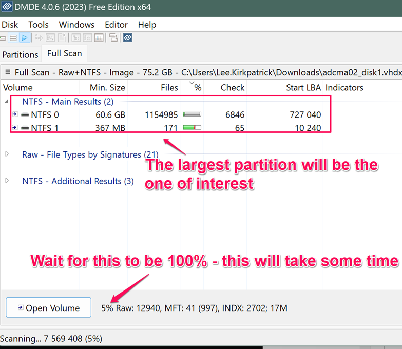 スキャンが完了するのを待ちます。仮想ディスクのサイズによっては時間がかかる場合があります。このプロセスの間、[Open Volume] ボタンには触れないでください。図 4 に示すように、このプロセスが完了するとパーティションが表示されます。多くの場合、DMDE が発見したパーティションのうち最大のものが最も復元したいパーティションです。