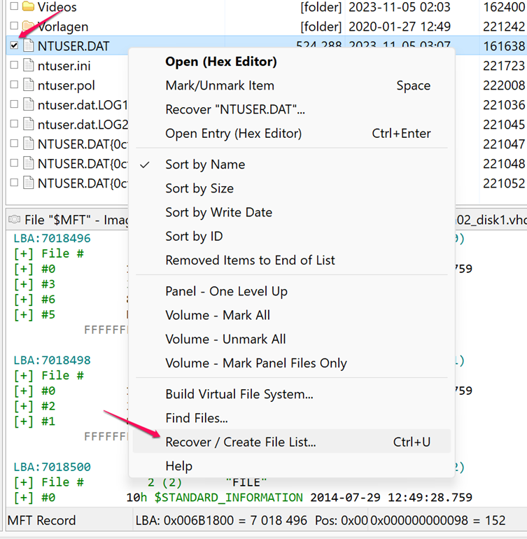目的のファイルを見つけたら、クリックして選択します。ハイライトされたファイルを右クリックし、[Recover / Create File List] を選択します。