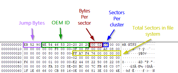 図 18: NTFS ヘッダーのから確認できるそれぞれの値 (count 値は「Total Sectors in file system (ファイルシステム内の総セクタ数)」と表示されています)