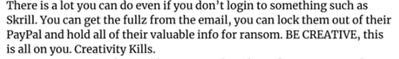 図 1: しつこい攻撃者になるためのアドバイス。Skrill はデジタルウォレットのプロバイダー、「fullz」は被害者の個人情報一式 (名前や住所など) を意味します。このスクリーンショットのテキストの筆者は、被害者のウォレットを直接攻撃する以外に、Genesis のデータを用いて行える活動について述べています。
