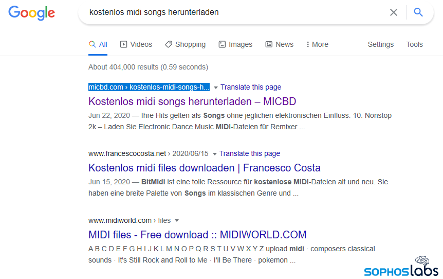 たとえば、 MIDI 音楽ファイルのダウンロードに関する検索クエリ (ドイツ語) を例に挙げてみましょう。この検索結果のスクリーンショットは、micbd.com という Web サイトを示しています。