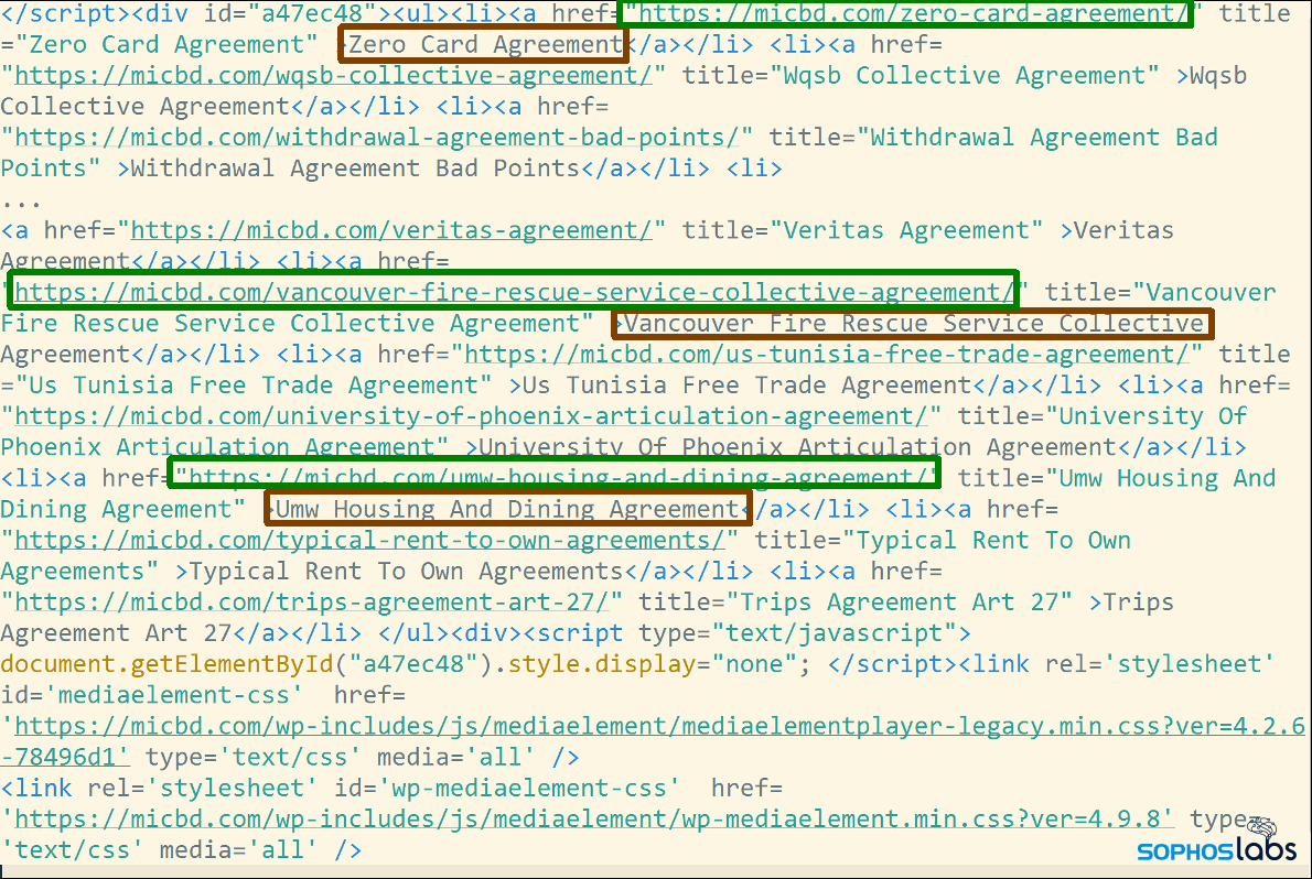 しかし、このページのソースコードを見てみると、誰かが大量の検索キーワード ( 緑枠内 ) を作成し、Web サイト内でホストされていると偽る実在しないページを指すリンク (赤枠内) として、Web サイトのフロントページ内に埋め込んでいることがわかります。これらのリンクは、ユーザーがページを閲覧する際には表示されませんが、検索エンジンはこれらのリンクをインデックス化します。攻撃者はこのようにして検索結果に影響を与えています。また、ページの約 3 分の 2 を占める document.getElementById(“a47ec48”) という JavaScript もありますが、これも攻撃者によって Web ページ内に設置されています。