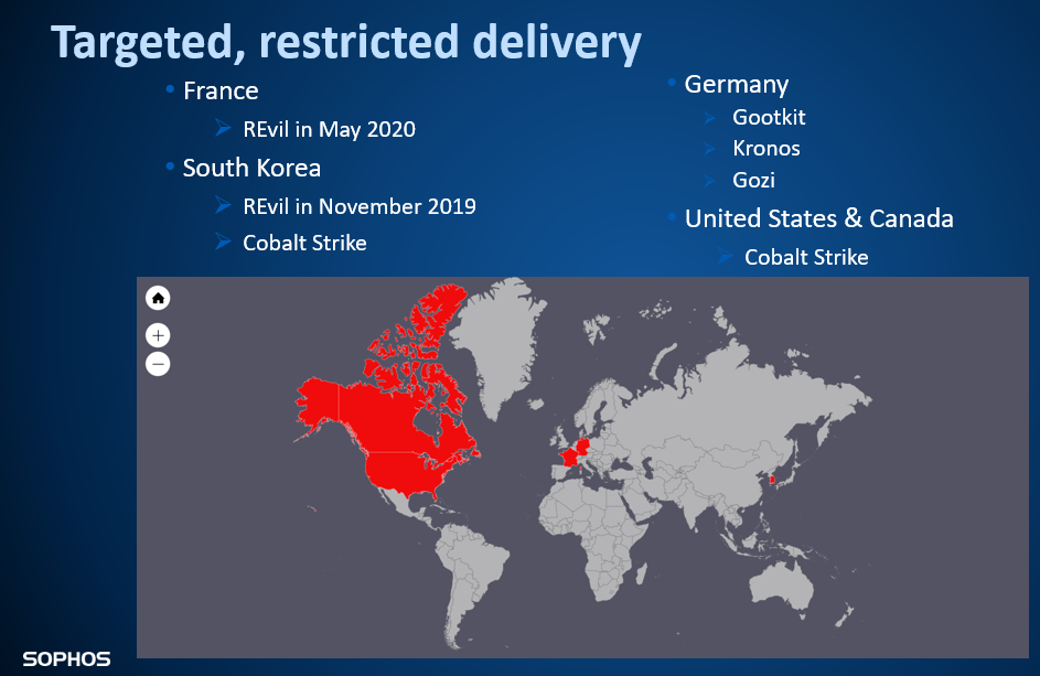 トラフィック整理役としてのマザーシップは、 (a) Google の検索結果をクリックした人、 (b) 地理的に対象となる地域にいる人、 (c) Windows ブラウザのユーザーエージェントを使用している人にのみ、悪意のあるコードを配信します。Gootloader は、米国、カナダ、ドイツ、フランス、韓国を標的とし、地域ごとに異なったペイロードを配信することが確認されています。
