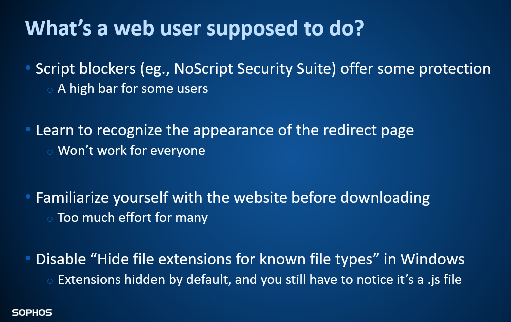 誰もが Gootloader の偽フォーラムページの外観に精通しているわけではありませんが、もし外観の変化に気が付くことができれば、コンピュータ上で何か問題が起こる前に攻撃を認識することができます。スクリプトブロッカーのようなツールは、ある程度の防御効果はあるものの、一部の人にとっては使いづらく、また一般的に Web 操作のエクスペリエンスを損なってしまう面があるのは否めません。