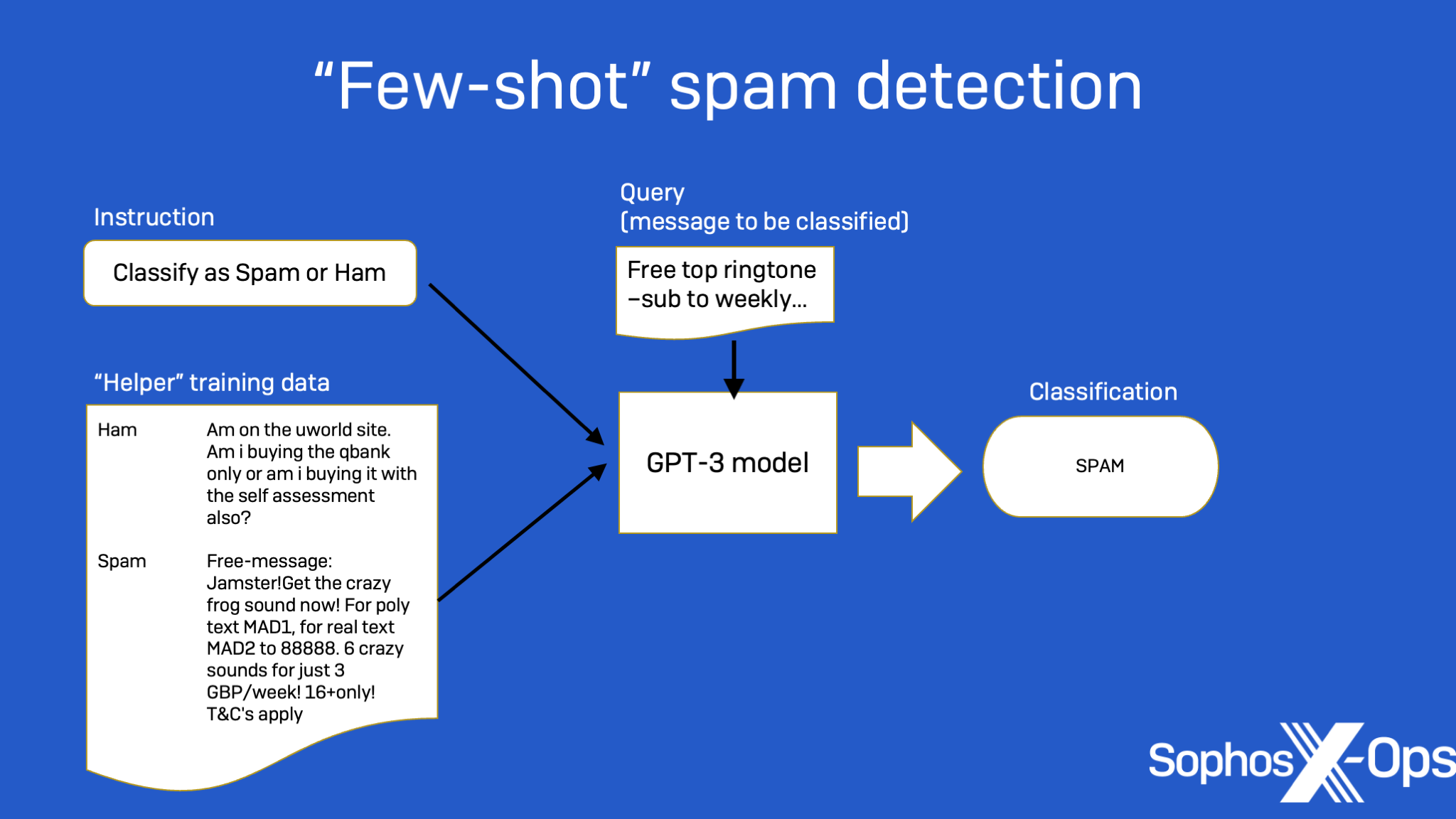 Lee は、別の実験セットで同様の Few-shot learning アプローチを用いて、GPT-3 をスパムの分類と悪意のあるコマンド文字列の検出のタスクに適用しました。