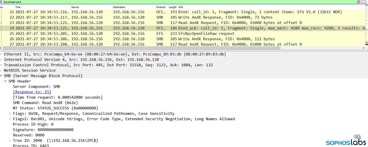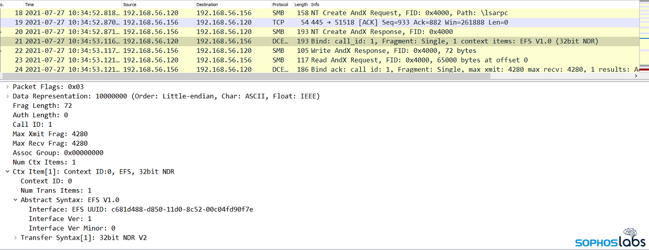 The attacker’s machine (A) sends a DCERPC bind request to the LSARPC service on the server (B). The UUID of LSARPC service is c681d488-d850-11d0-8c52-00c04fd90f7e, which is shown in the packet capture below.