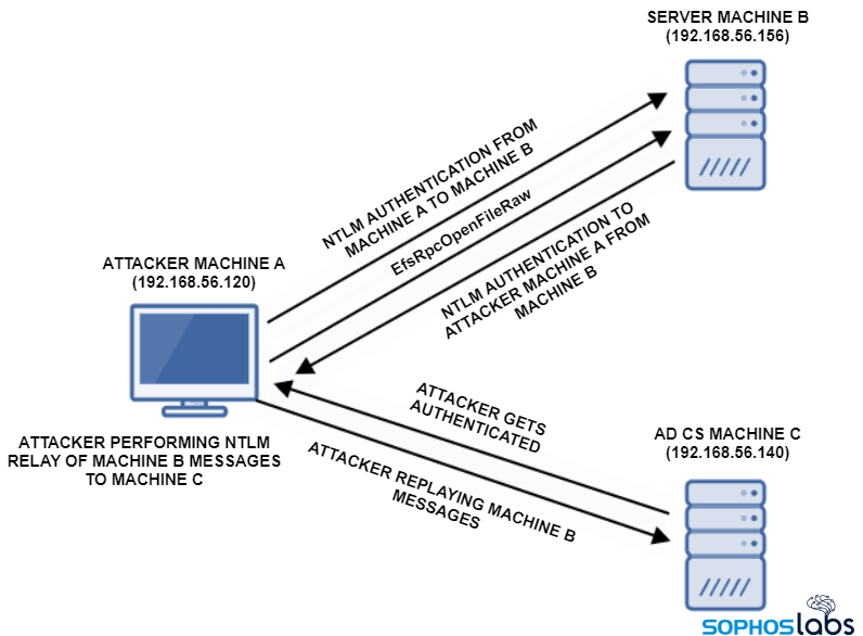 In the diagram above, the attacker runs the exploit from their machine (labeled A), and acts as a relay between the server (B) and the Active Directory Certificate Services server (C).
