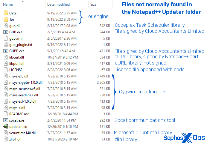 We also found that the folder containing the self-updater in the malicious “portable Notepad++” folder contained 15 additional files not included with the legitimate portable installation zip.