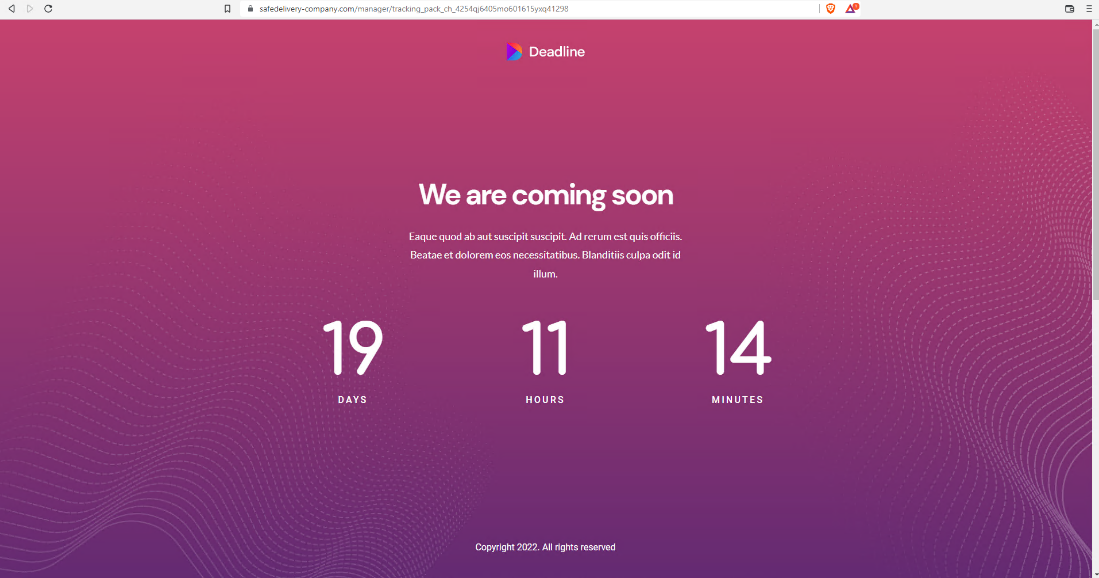 In fact, this is a behavior observed in other malware incidents. The countdown timer resets itself with a random days/hours/minutes value every time you reload the page. The code that runs this page is a ReactJS template called Deadline. The people using this haven’t even bothered to modify the template’s boilerplate lorem ipsum text block.