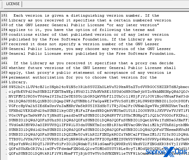 Like many open-source projects, Notepad++ is released under the GNU public software licensing scheme, which requires that developers include a plain text file with the terms of the license agreement. Notepad++ usually includes a plain text file named LICENSE. We also found a LICENSE file on this installation, but someone had appended a blob of base64-encoded data to the document. The normal copy of LICENSE is only 8kb in size; this LICENSE was 59kb larger than the original.