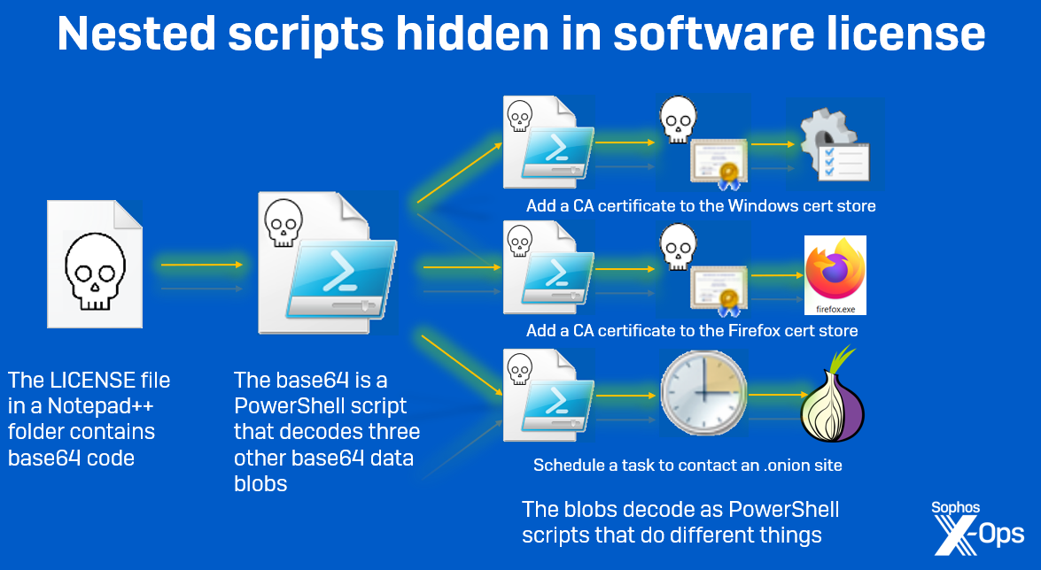 The Notepad++ executables in the archive on VirusTotal were signed with the same revoked certificate used to sign the executables we recovered during the postmortem investigation. Upon closer examination, the content of the decoded scripts originating with the modified LICENSE file found in the VirusTotal sample closely resembled those we recovered from the infected computer. Only the variable names and .onion dark web addresses were changed; the scripts otherwise contained identical instructions.
