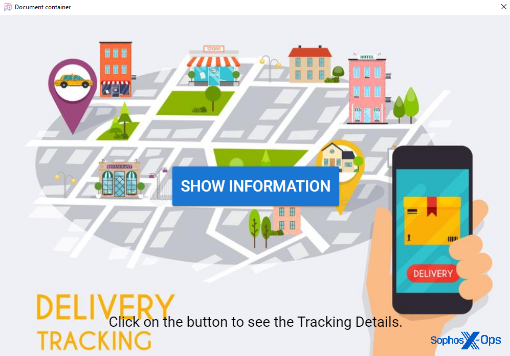 When executed, the Electron app unpacks the Chromium browser files into a temporary directory and launches a program called Universe Parcel Service.exe, which is just a renamed Chromium executable. The app displays a full-screen window centered around a button labeled “Show Information” with the text “Click on the button to see the Tracking Details” at the bottom of the page.
