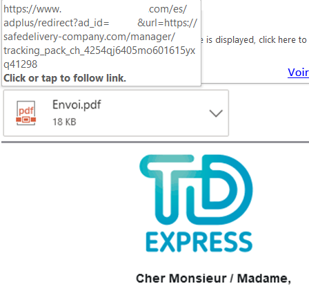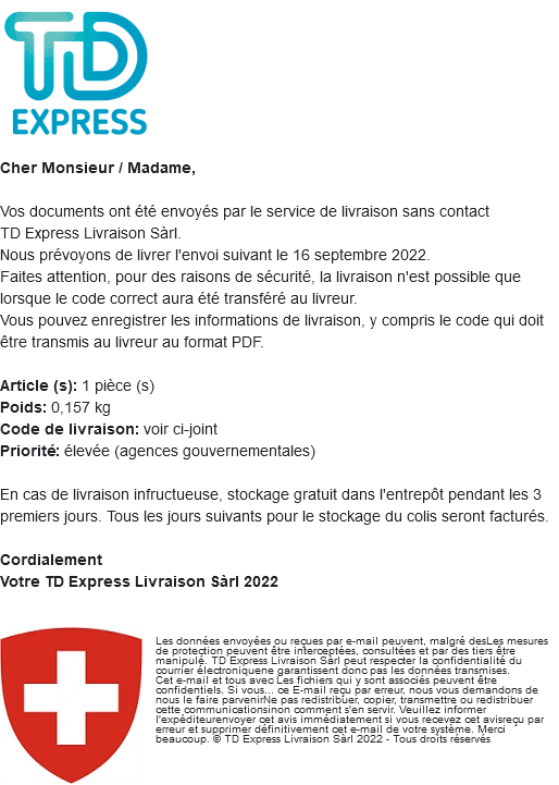 While the caller was still on the phone with the employee, the employee received an email message, purportedly from the caller’s shipping company. The email message shown below (written in French) said that a PDF file attached to the message contained the code the delivery driver was waiting to hear before they could bring the package to the employee’s location.