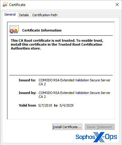 The certificate appears to be crafted to mimic one issued by the legitimate certificate authority Comodo, but was not issued by them.