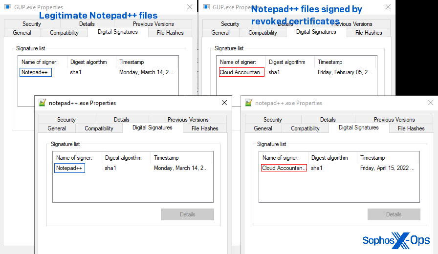 The folder contains everything that normally is included with the official “portable” download, but with a few notable changes: The Notepad++ executable and other executable components (notably, the program’s self-update utility) had been cryptographically signed using a now-revoked signing certificate originally issued to an organization called Cloud Accountants Limited, instead of the still-valid certificate issued to the Notepad++ organization.