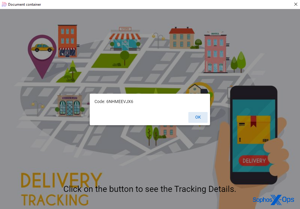 The message body says that “your documents had been sent by a delivery service that hasn’t had contact with” the destination. It goes on to say that, for reasons of security, delivery isn’t possible unless the target provides the correct code to the shipper, and that the target can only get the code from the attached PDF.