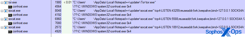 Meanwhile, in the background, the scripts embedded in the Notepad++ LICENSE file begin to run, and the script invokes the Socat utility to open multiple connections to Tor, listening on a variety of high port numbers for inbound traffic.