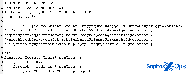 The third script sets up a scheduled task that leverages two programs from the Notepad++ updater folder – GUP.exe and GUPP.exe – to phone home, once a day at midnight (local time), to one of five .onion addresses, randomly chosen from a hardcoded list also embedded in the script.