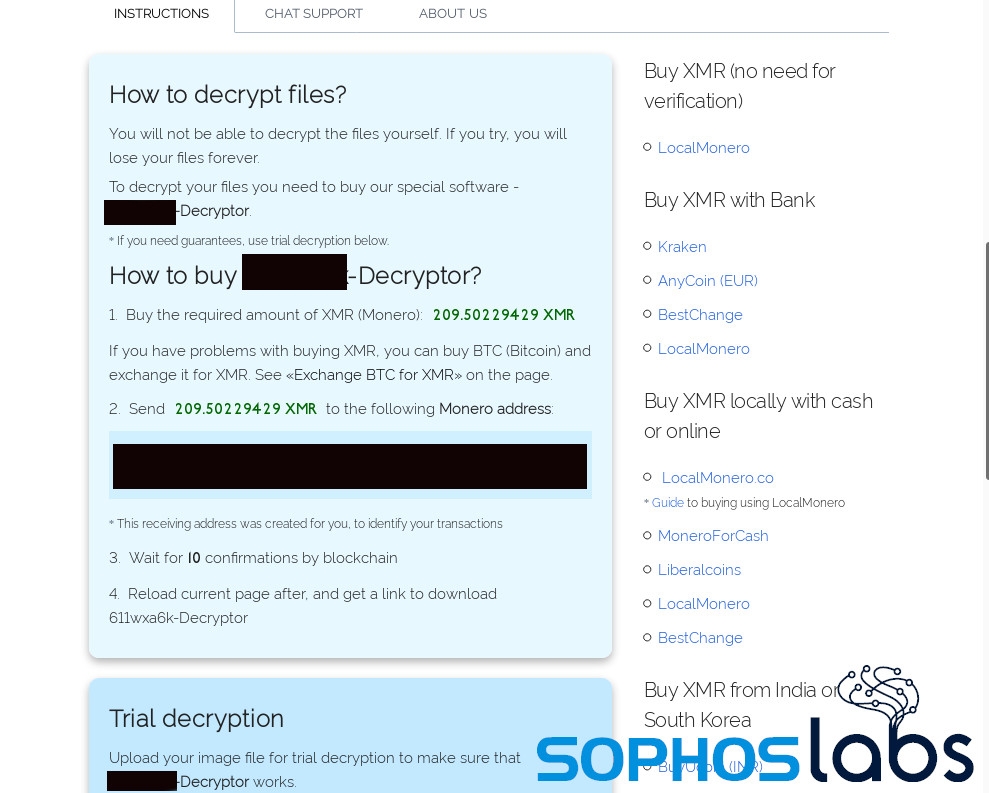 身代金要求メモの指示に従うと、次のページが表示されます。Monero での支払いを要求されます。