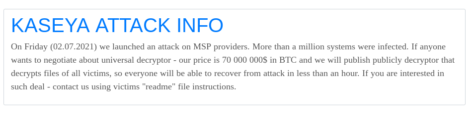 REvil のオペレーターは、100 万台以上のデバイスがこの悪意のあるアップデートに感染したとの文章をダークウェブ「Happy Blog」に投稿しました。また、7 千万ドル相当の BitCoin の支払いを条件に、攻撃を受けた被害者に復号化ツールを提供する意思がある、とも述べています。