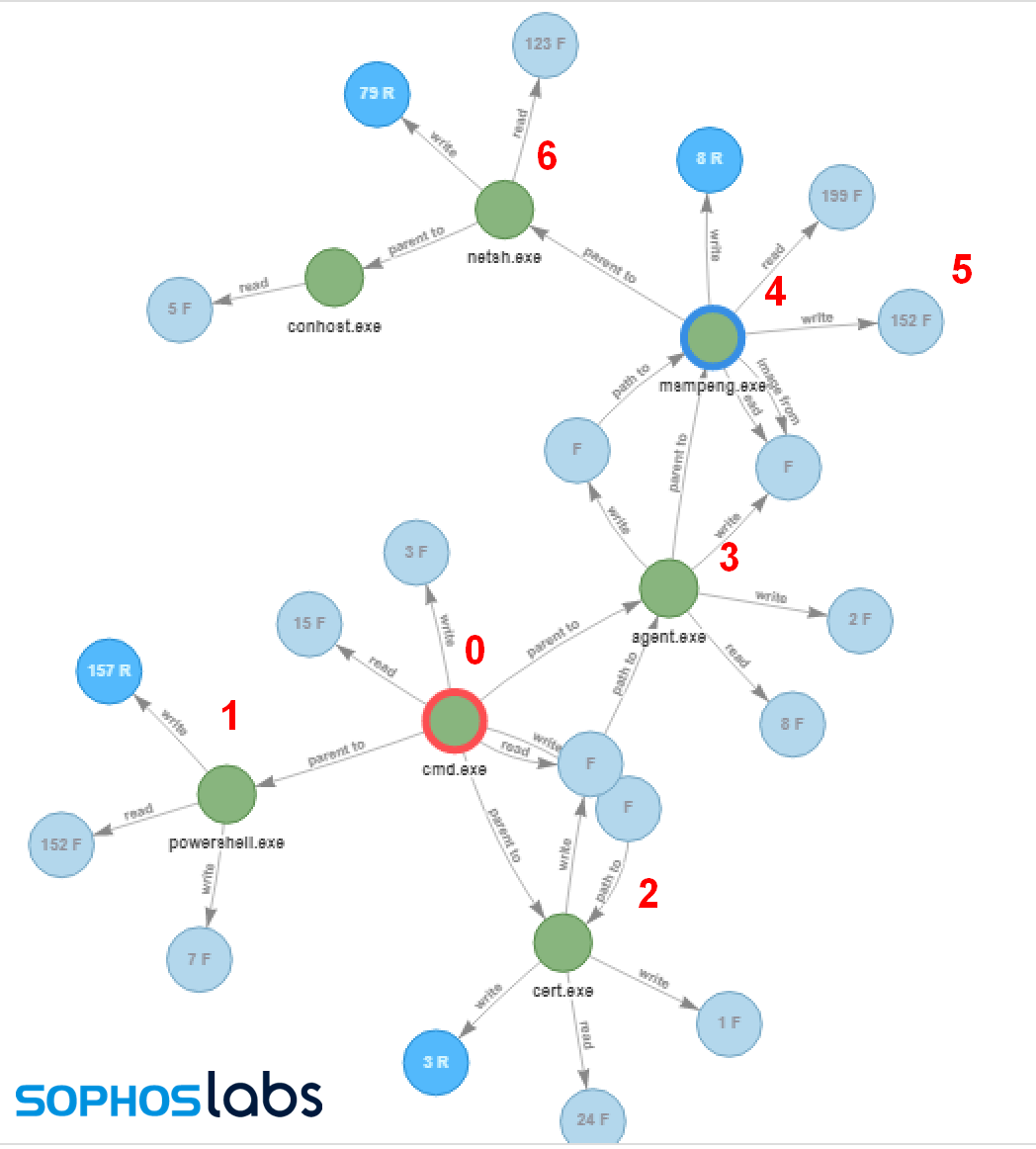 最後に、Kaseya の AGENTMON.EXE プロセスによって AGENT.EXE が起動され (システムレベルの権限を継承) 、ランサムウェアのドロップが始まります。