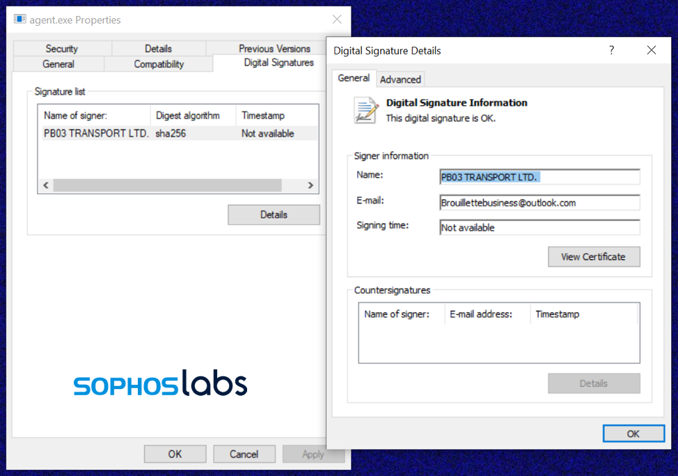 コピーされた CERTUTIL は、Base64 エンコードされたペイロードファイル「AGENT.CRT」をデコードし、Kaseya の作業フォルダにある実行ファイル「AGENT.EXE」に書き込むために使用されます。AGENT.EXE は、「PB03 TRANSPORT LTD.」の証明書で署名された有効な Authenticode を持っています。ソフォスがこれまで確認したこの証明書は、どれも REvil マルウェアに関連したものであり、今回の証明書は盗まれたものか不正に入手されたものである可能性があります。AGENT.EXE には、攻撃の 1 日前にあたる 2021 年 7 月 1 日 (14:40:29) というコンパイラーのタイムスタンプが含まれています。
