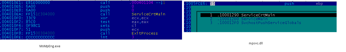 その瞬間から、MPSVC.DLL の中の悪意のあるコードは、MSMPENG.EXE が悪意のある MPSVC.DLL の ServiceCrtMain 関数 (無害な MPSVC.DLL のメイン関数でもある) を呼び出す際に、Microsoft のプロセスの正常な実行フローを乗っ取ります。