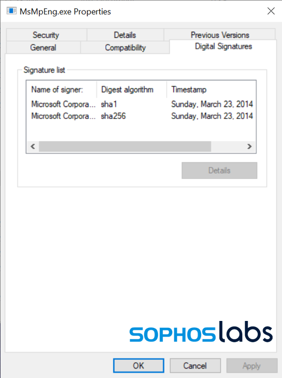 AGENT.EXE がドロップしたのは、予想外のファイルでした。ドロップされた MSMPENG.EXE は、有効期限が切れた古いバージョンの Microsoft Antimalware Service Executable です。これは、Windows Defender バージョン 4.5.218.0 の脆弱なアプリケーションで、2014 年 3 月 23 日に Microsoft によって署名されています。