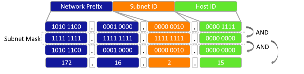 The beginning of an IP address is the location of the destination network, called the Network Prefix, and the end is the location of the device on that network, called the Host ID. The network prefixes are written in a format that uses a slash (“/”) character followed by a decimal number to indicate how many bits refer to the network prefix. For example, 198.51.100.0/24 has 24 bits allocated for the network prefix and the remaining 8 bits reserved for host addressing resulting in the range 198.51.100.0 to 198.51.100.255 addresses belonging to this network. A subnet is a division of the larger network to smaller ones. To find the destination of a smaller network, a subnet mask divides the IP address into a network address and host address. In the example in Figure 1, the subnet-mask indicates a packet should first route to the network address 172.16.2.0 and then route to the host address 0.0.0.15.