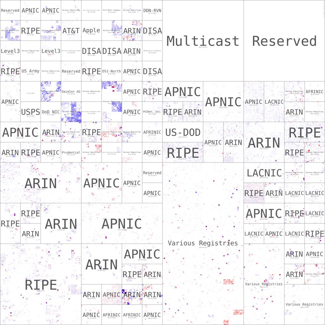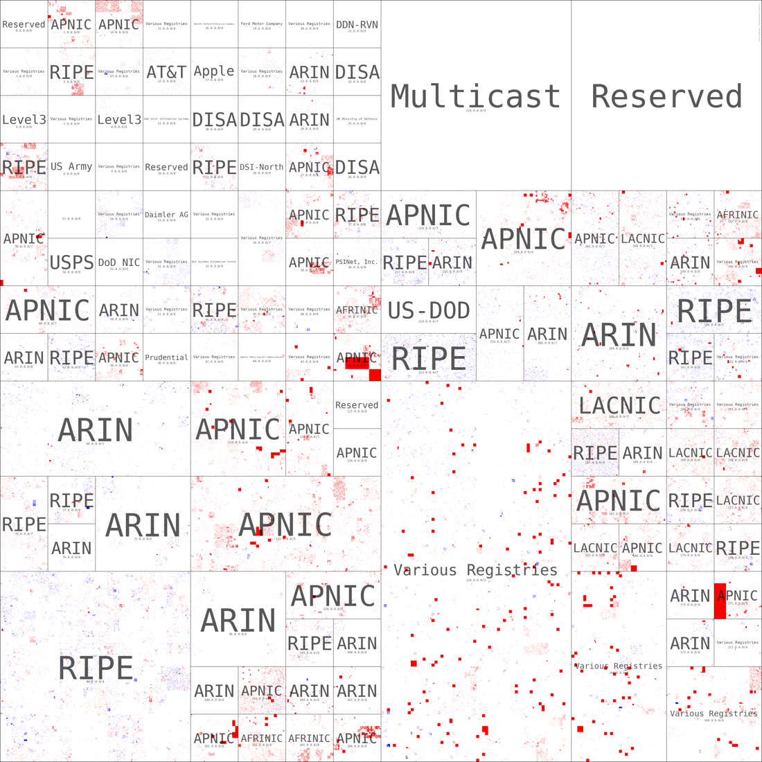 SophosAI collected over 450,000 IP addresses hosting web-content labeled either malicious or benign using internal telemetry tools. They also collected over 400,000 IPs related to e-mail campaigns from existing anti-spam lists. Tamás Vörös, a data scientist in SophosAI, used existing knowledge of how IP address space is allocated to Internet Service Providers (ISPs) to generate a heat map visualizing web and spam activity where blue points represent benign activity and red malicious. For more details on how these plots were generated, please read the more in-depth SophosAI blog post.