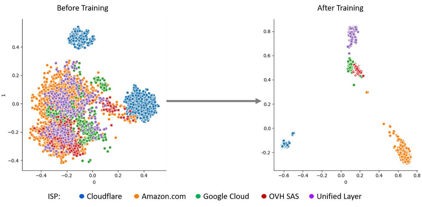 Figure 4. A visualization of IPs and their respective ISPs after model training. Each dot represents an IP address and the dot’s color indicates which ISP the IP belongs too. Before training, there is no real differentiation between the model’s understanding of the ISP space in terms of IP. However, after training, there are distinct clusters of IP addresses based on the ISP they belong to.