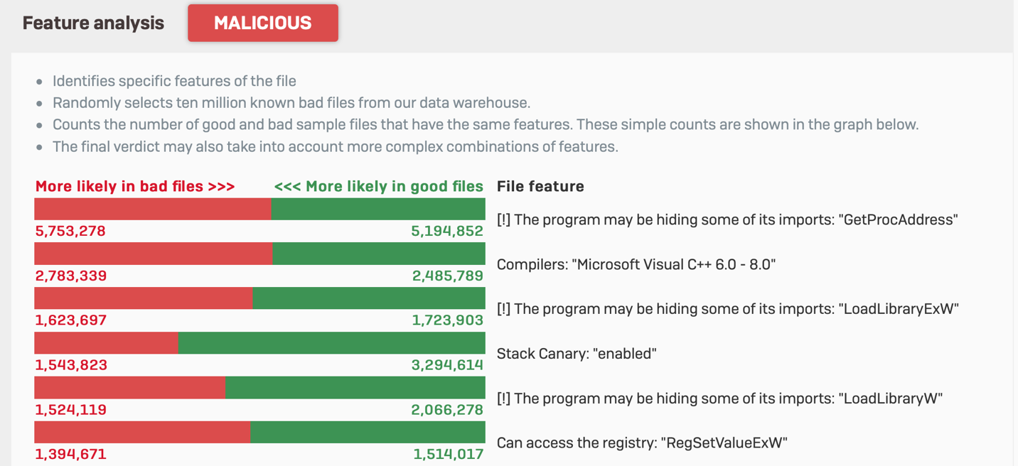 Threat intelligence uses multiple machine learning models to analyze the characteristics, features, genetics, and global reputation of the file. It compares the new file with millions of known good and bad files in the SophosLabs database to render a verdict in seconds without the need to execute it in real time. This makes it remarkably fast and effective at identifying new threats and new variants of existing threats, particularly with files which are not easily sandboxed, such as password-protected documents.