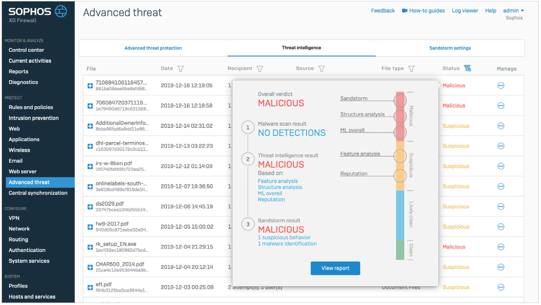 When XG Firewall’s Xstream DPI engine performs AV analysis on a file entering the network and determines there is active code, it holds the file temporarily and sends it to the SophosLabs Intelix service in the cloud for both static and dynamic (sandbox) analysis. It then provides a detailed overview of the results and only releases the file to the downloader or email recipient if the file is declared safe.
