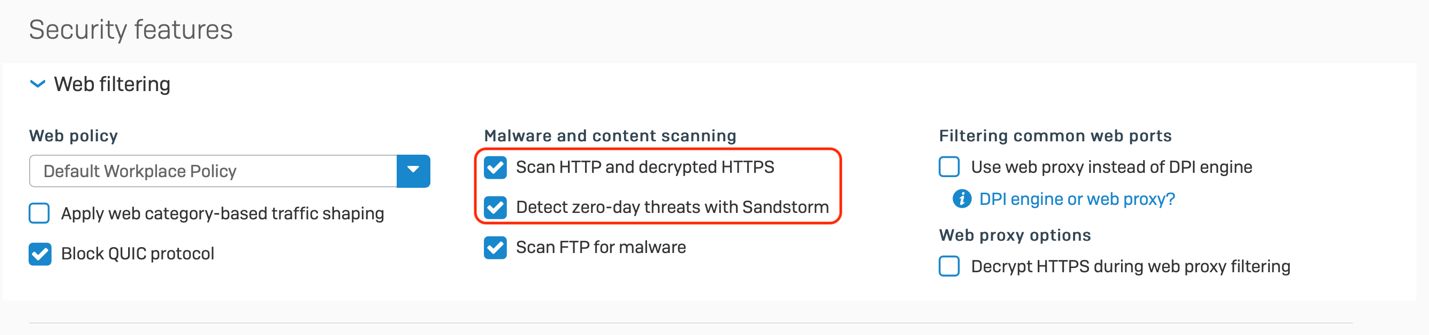 - In all firewall rules governing web traffic for your network, ensure you have the following two web filtering security options set to scan web traffic and use the latest zero-day protection technologies outlined here:
