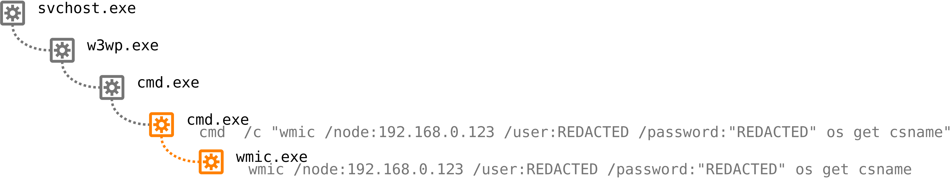 脅威ハンティングの担当者が、最初のレッドフラッグを確認しました。リモートコンピュータでコマンドを実行するために、WMIC が使用されていました。これは攻撃の兆候であるため、その命令の送信元についても調査が行われました。