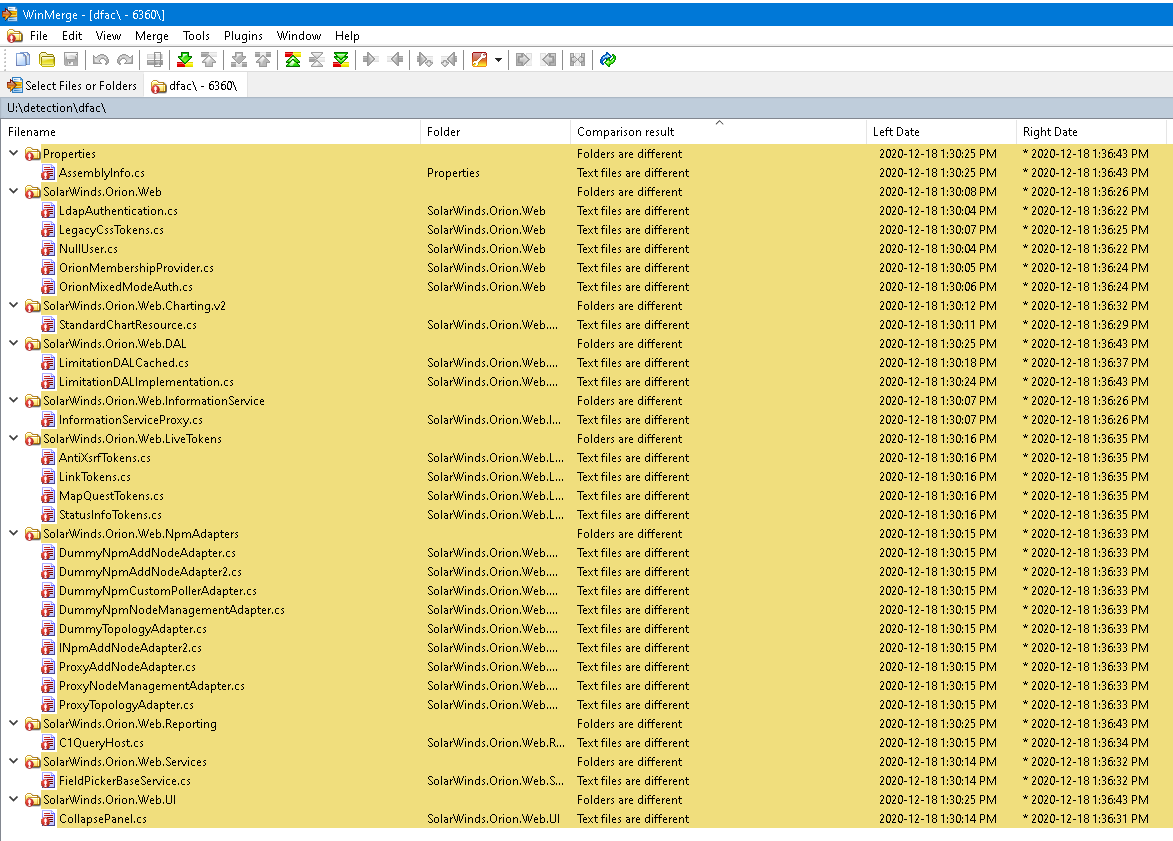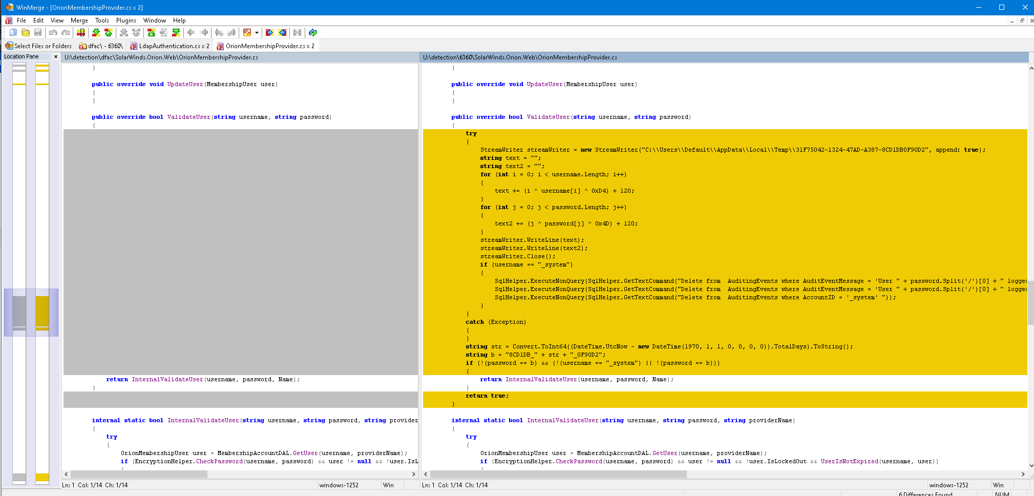 SophosLabs は、攻撃が疑われるこの DLL を完全にデコンパイルし、一般的な diff アプリケーションである WinMerge を使用し、既知の正常な検体と比較しました。 WinMerge は、ファイルを比較し、相違点をハイライトするツールです。