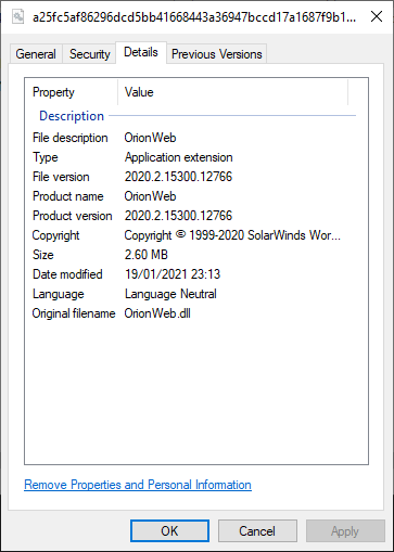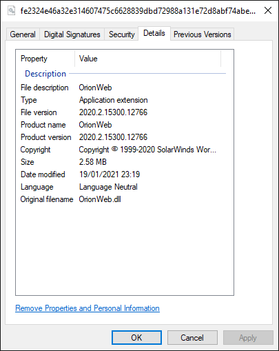 MTR は、検出したファイルを問題のないことがわかっている OrionWeb.dll のコピーと比較したところ、このファイルは元々署名されており、本来署名されているべきファイルであることが明らかになりました。では、署名を削除したのは誰で、その理由は何でしょうか?