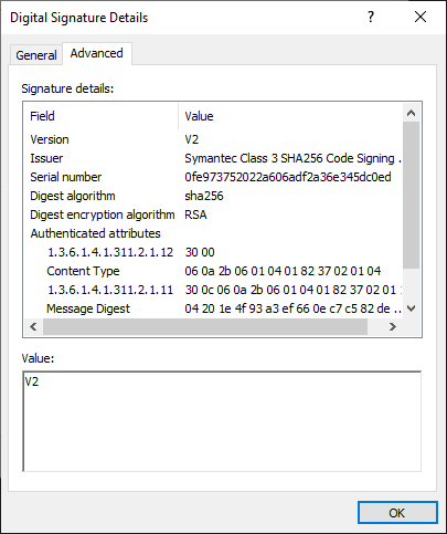 この DLL が第三者によって変更されると、このデジタル署名はこのファイルの完全性を検証できなくなります。しかし、署名が完全に削除される場合、ファイルの完全性を検証するために使用できるものが全くなくなります。
