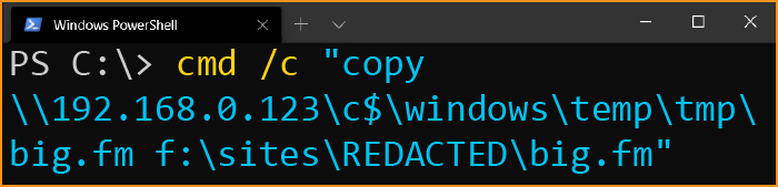 cmd /c "copy \\192.168.0.123\c$\windows\temp\tmp\big.fm f:\sites\REDACTED\big.fm"
